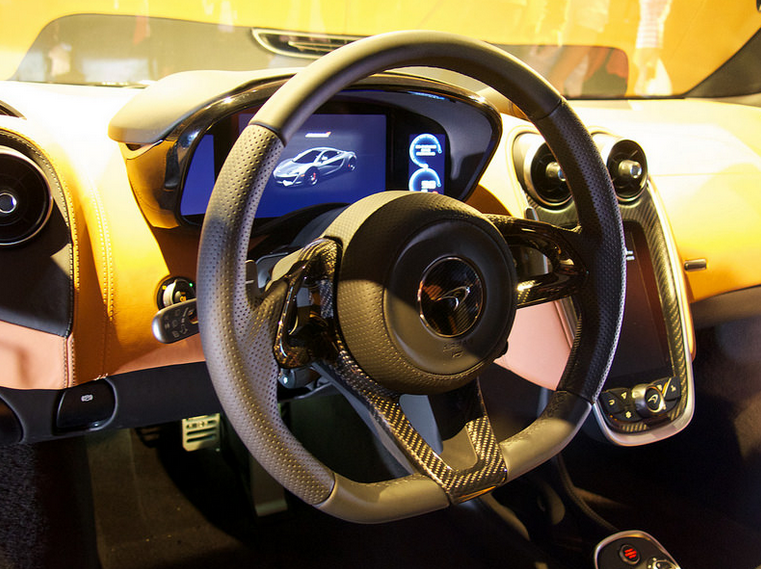 The 570S MSO-X cabin blended exposed carbon fiber and Alcantara trim and included key amenities. (Source: McLaren Cars)
