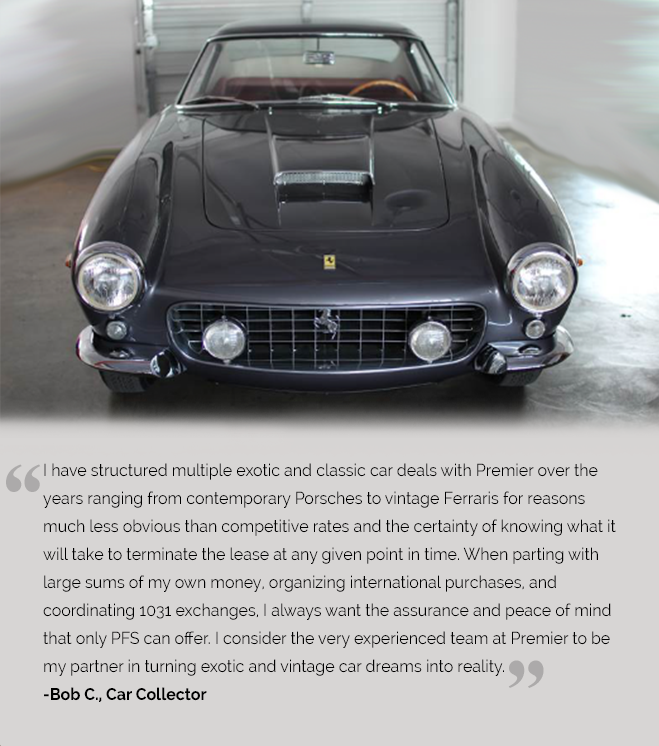 Behind the scenes, there were many hours of coordination, communication and cooperation with the seller, the transporter, customs and truckers, with PFS helping at every turn. “I have structured multiple exotic and classic car leases through Premier Financial over the years, ranging from the contemporary Porsche Carrera GT and Ferrari Enzo to the classic Alfa Romeo TZ1 and my 1962 Ferrari 250 GT SWB,” said Cohen. “I consider the very experienced team at PFS to be my partner in making exotic and vintage car dreams into reality.”