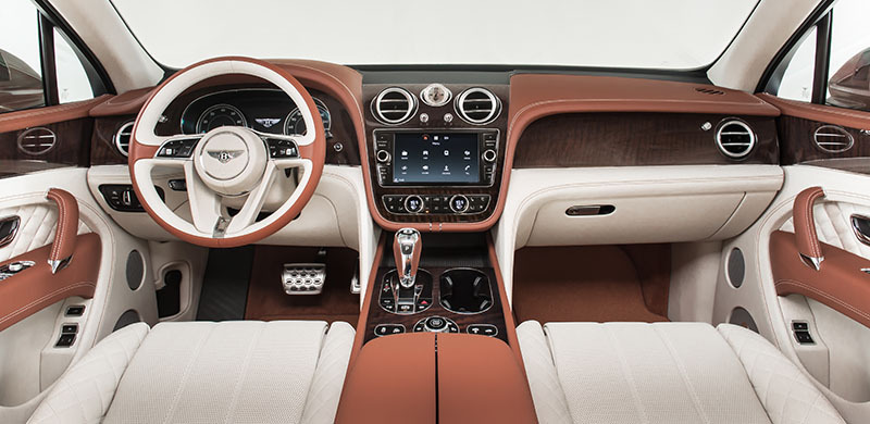 The Bentayga cabin shows the marque in top form. Choose from 15 carpet options and 15 choices of interior bull hide colors. Bentley assures that the bulls enjoyed what life they had in cool European climates. You can choose one of seven different interior veneers for the 15 hand-selected pieces of wood trim.