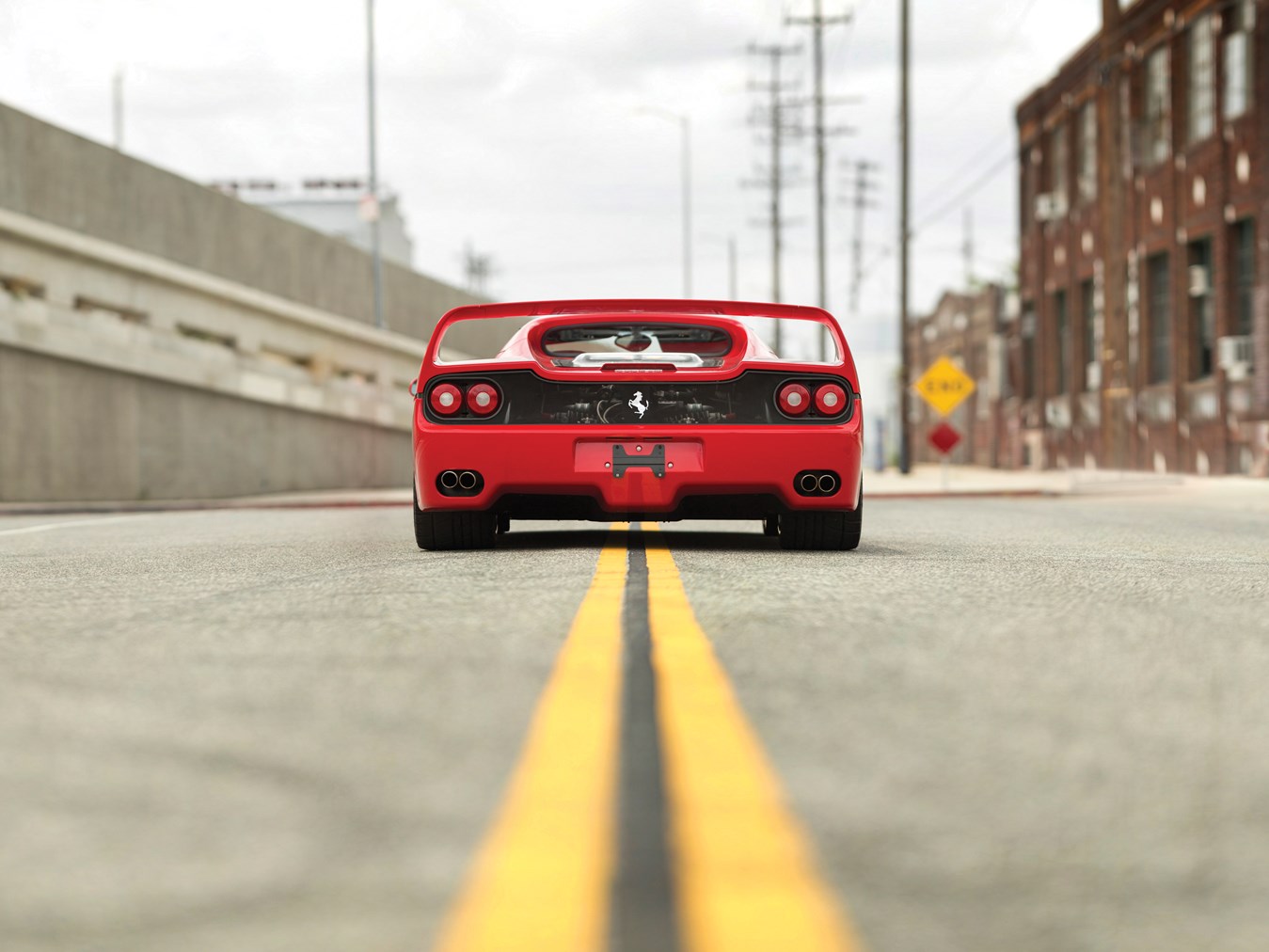 Raising the engine cover reveals the racecar nature of the chassis. Springs and dampers are mounted horizontally and operated via pushrods by the control arms. There’s a similar setup in front. The mid-engine layout puts 57 percent of the car’s mass on the rear wheels, and so to prevent the F50 from becoming a drift machine through every curve, Ferrari made the front track 20mm wider than the rear. There is no ABS braking.