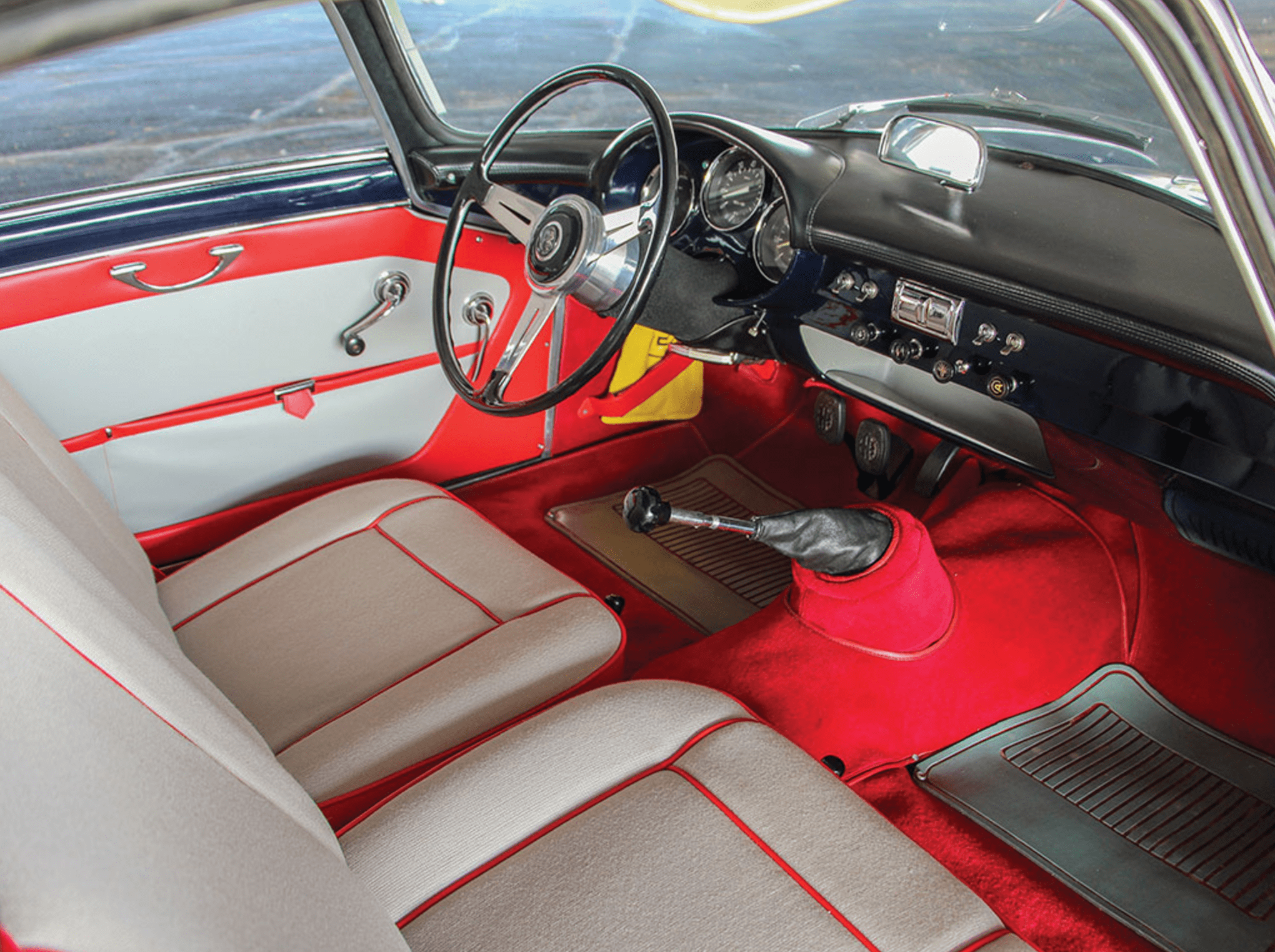 The 1960 Sprint Speciale offered by RM/Sothebys was restored several years ago. Its interior is upholstered in soft grey interior piped in red accents, and with red carpeting. The level of detail and finish throughout is said to be impressive, with the paint still having an excellent shine, and the upholstery appearing tight and fresh. Mileage is given as 37,476 and the engine is believed to be original.